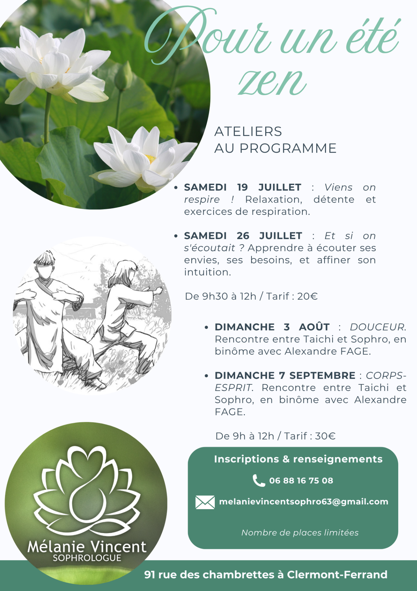 Découvrez le programme de l'été au cabinet ! Des ateliers pour prendre soin de soi, faire une pause et découvrir de nouvelles activités. Pour tout renseignement et inscription, par téléphone au 06 88 16 75 08.